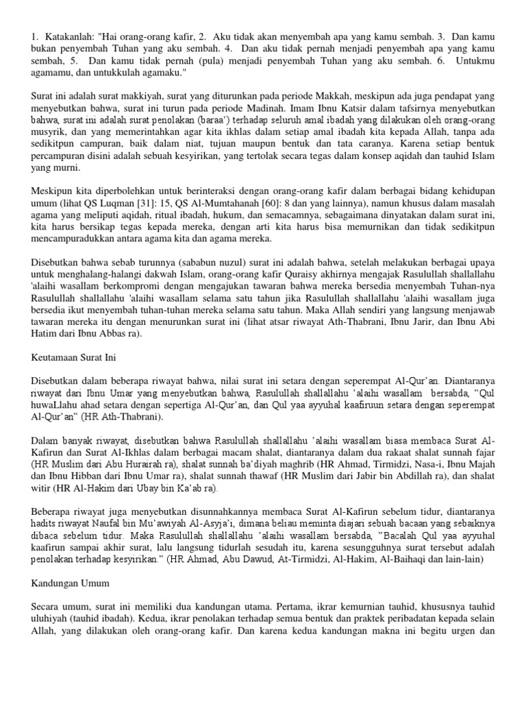 Surat al kafirun berisi ajaran toleransi untuk tidak memaksa orang lain dalam aqidah dan beribadah. Berikut ini terjemahan asbabun nuzul dan tafsir surat al kafirun. Aku tidak akan menyembah apa yang kamu sembah. (diriwayatkan oleh abdurrazaq yang bersumber dari wahb dan ibnul mundzir yang bersumber dari juraij.) surah al kafirun ini memiliki ayat yang sedikit dan pendek, jadi sangat mudah untuk dihafalkan. Surat annisa ayat 1 surat attahrim ayat 6.
