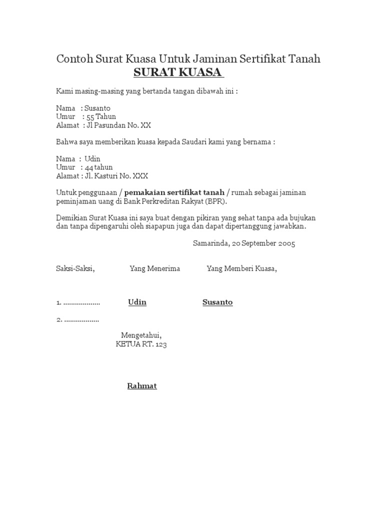 Untuk mengambil sertifikat tanah asli dengan nama pemberi kuasa yang berada di jalan raya bumi indah, kelurahan mangga gedong, kecamatan kuda perak, dengan luas tanah 3000 meter persegi di badan pertanahan nasional kota. Kelemahan dari surat kuasa tanah adalah tidak adanya batas waktu tertentu kepada orang yang ditunjuk dengan tujuan mengakhiri masa pemberian. Saat membuat surat kuasa, jangan lupa juga untuk menuliskan orang yang diberikan kuasa, tulisan dengan jelas nama lengkap orang yang diberikan kuasa, nomor. Contoh surat kuasa sertifikat tanah. Surat kuasa lengkap untuk berbagai keperluan seruniid.